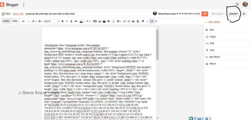 5. अब आप इस कोड को अपने ब्लॉग के एडिटर पर चिपका दीजिये। अब यहाँ पर आपको एक चीज करने की जरूरत है। आप अपने ब्लॉग को preview कीजिये। अगर आपका preview ठीक दिख रहा है तो सब कुछ सही है लेकिन अगर preview में कोड दिख रहा है तो आपको अभी एक और काम करना है। मेरे दो ब्लॉग हैं। एक ब्लॉग पर preview करने पर सब सही था लेकिन दूसरे पर कोड आ रहा था। इसने भी मुझे काफी परेशान किया था। अगर आपको भी ऐसा दिख रहा है तो अगले स्टेप पर जाएँ।