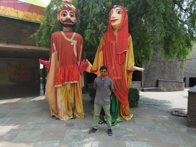 बाहर आये और फिर मनीष भाई ने बोला कि किधर जाना है। उन्हें बताया कि सामने डॉम में आम की प्रदर्शनी है और उसके आलावा इधर रंगारंग कार्यकर्म चलते रहते हैं। उन्होंने पहले डॉम में जाने का फैसला किया। हम लोग उधर की तरफ बढ़ गये। वहाँ जाते हुए हमे एक गत्ते के जानवर मिले जिसके साथ मैंने फोटो खिचवाई। बड़ा सा आममानुष मिला जिसके साथ हम दोनों ने फोटो खिचाई। मनीष भाई उसके साथ हाथ मिलाने लगे तो चौकीदार साहब ने उन्हें डांट दिया। मेरी हँसी छूट गयी।